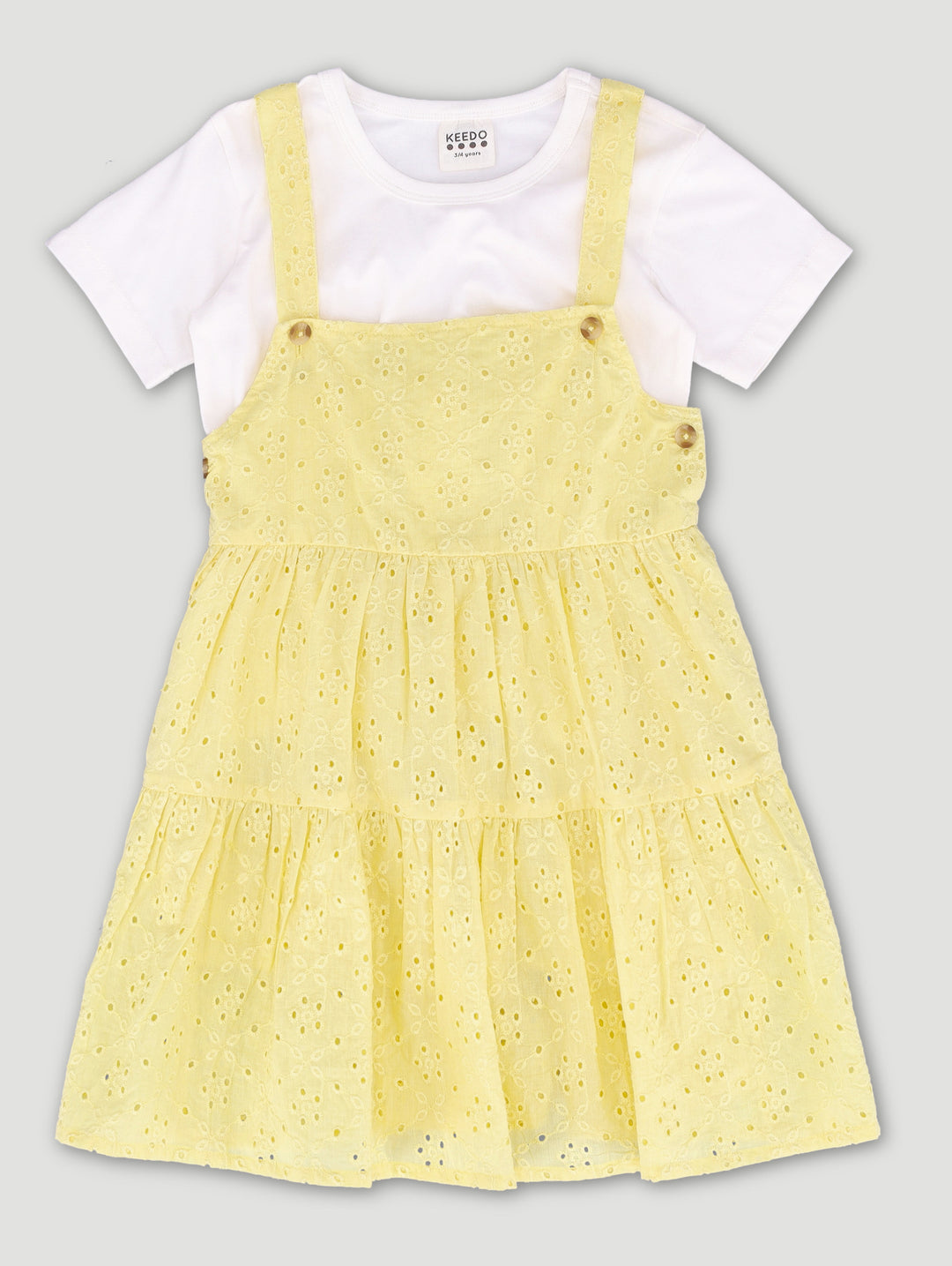 This beautiful yellow pinni dress is crafted with delicate anglaise fabric, making it perfect for any young girl. The intricate details add a touch of elegance and charm. Your little one will love twirling around in this dress, perfect for any special occasion!